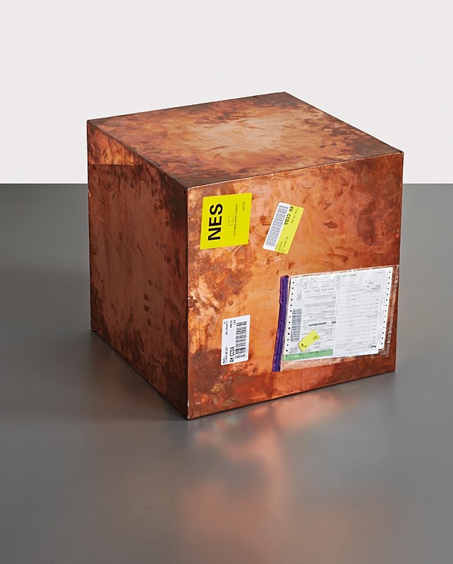Polished copper box, and accrued FedEx tracking and shipping labels, 50.8 x 50.8 x 50.8 cm (20 x 20 x 20 in.)